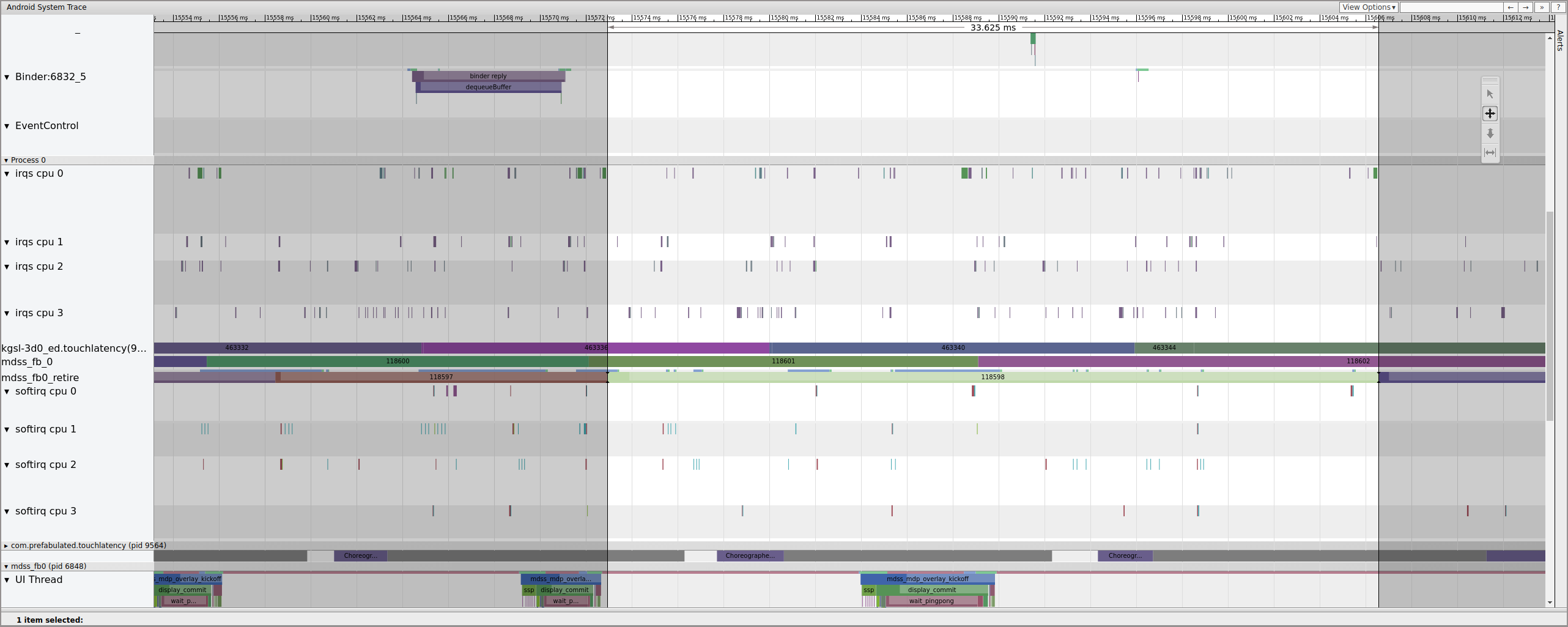 Selanjutnya, mdss_fb0 bangun pada CPU 0. mdss_fb0 adalah thread kernel pipeline tampilan untuk mengeluarkan bingkai yang dirender ke tampilan. Kita dapat melihat mdss_fb0 sebagai barisnya sendiri dalam jejak (gulir ke bawah untuk melihat).