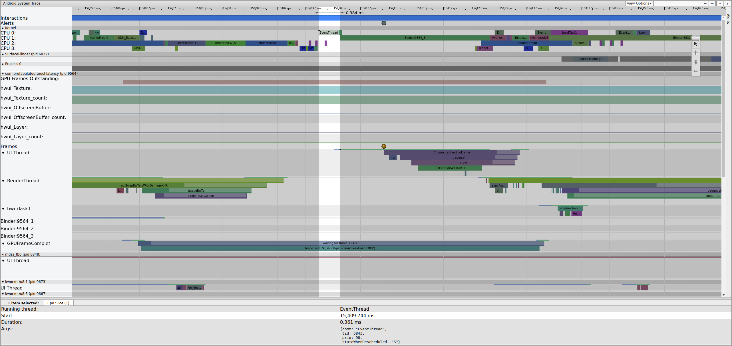 Gambar 2 menunjukkan utas TouchLatency UI dibangunkan oleh tid 6843, yang sesuai dengan EventThread. Utas UI membangunkan, merender bingkai, dan mengantrekannya untuk digunakan SurfaceFlinger.