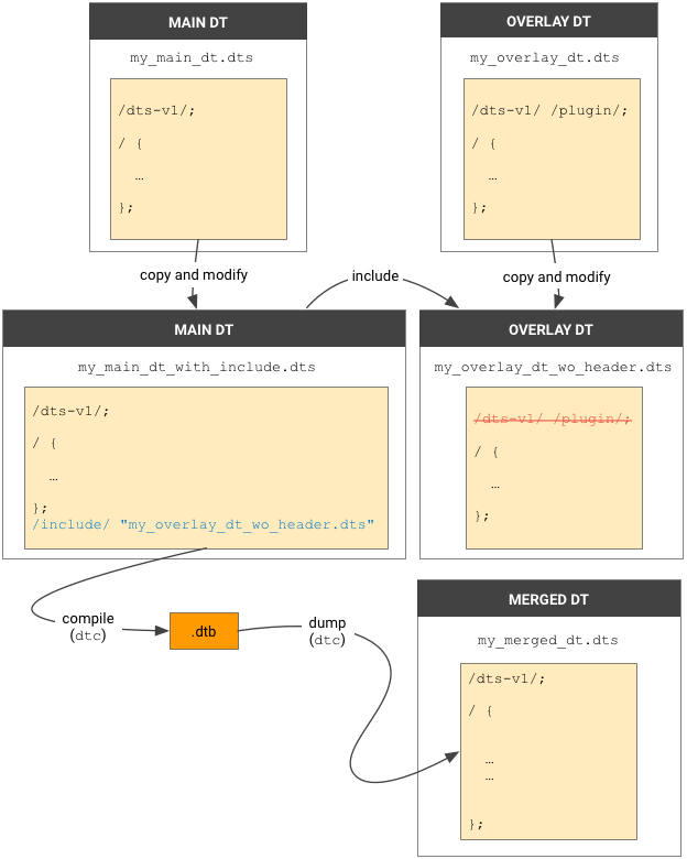 dtcبرای کامپایلmy_main_dt_with_include.dtsاستفاده کنید تا DT ادغام شده را بدست آورید، که باید همان نتیجه DTO باشد. به عنوان مثال:dtc -@ -O dtb -o my_merged_dt.dtb my_main_dt_with_include.dts