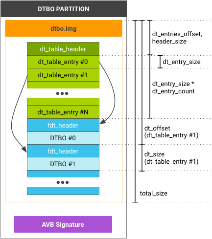If your device tree blob (DTB) or device tree blob for overlay (DTBO) is in a unique partition, for example, the dtb and dtbo partition, use the following table structure and header format: