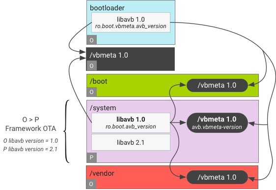Para dispositivos lançados com o Android 9 ou versões anteriores, ao atualizar para o Android 10, os requisitos de versão do AVB na matriz de compatibilidade do framework são comparados com a versão atual do AVB no dispositivo. Se a versão do AVB tiver um upgrade de versão principal durante um OTA (por exemplo, de 0.0 para 1.0), a verificação de compatibilidade do VINTF no OTA não vai refletir a compatibilidade após o OTA.