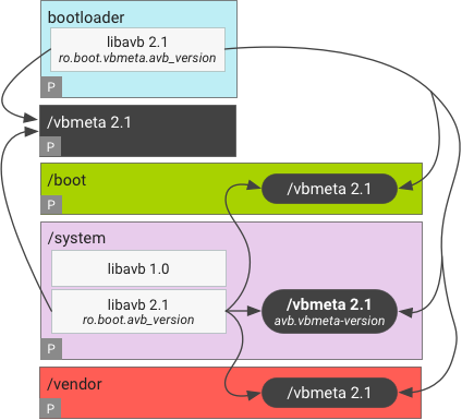 O carregador de inicialização ou o SO Android podem conter duas cópias de bibliotecas libavb, cada uma com uma versão PRINCIPAL diferente para dispositivos de upgrade e de lançamento. Nesse caso, a mesma imagem de sistema não assinada pode ser compartilhada, mas as imagens de sistema assinadas finais são diferentes (com avb.vbmeta-version diferentes):