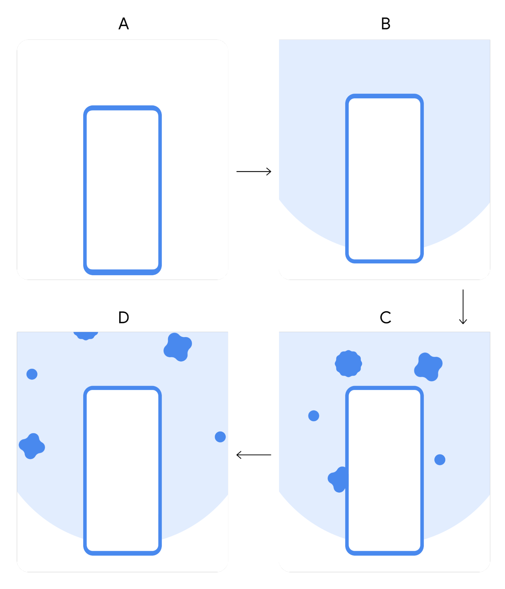 2. 手机向中心移动,同时尺寸变大。若干形状开始进入屏幕。