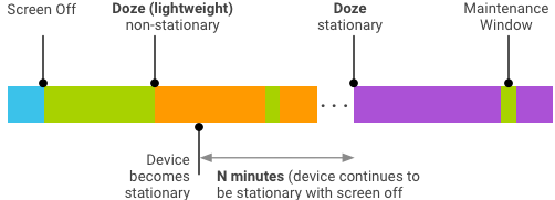 Doze زمانی شروع میشود که پلتفرم تشخیص دهد که دستگاه بیحرکت است و زمانی پایان مییابد که یک یا چند فعالیت معیار خروج رخ دهد.