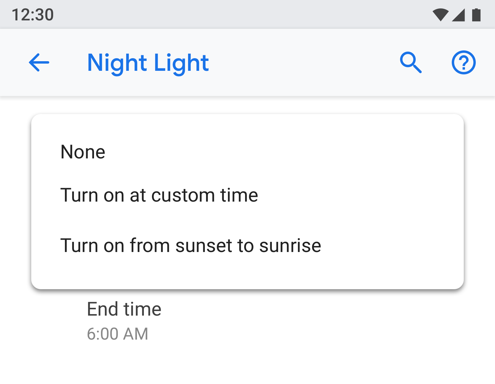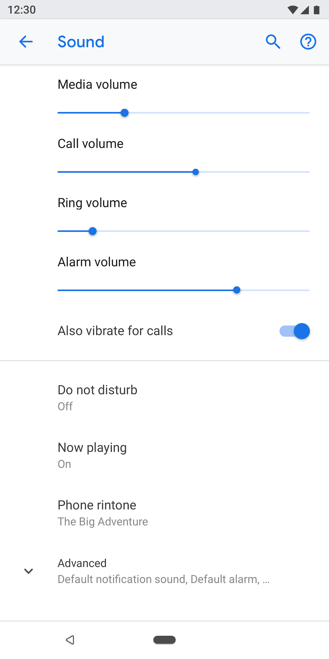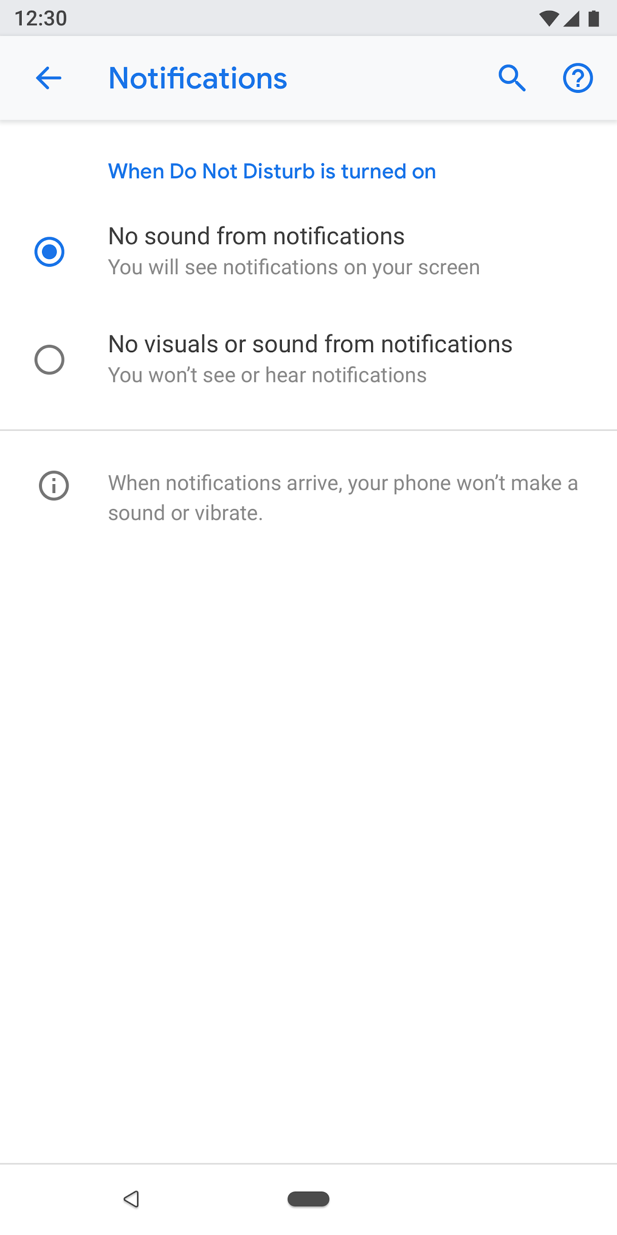 If a screen has many settings, they can be grouped and separated by a divider. Unlike older Android versions, dividers are now used to cluster settings in a group, rather than separating individual settings.